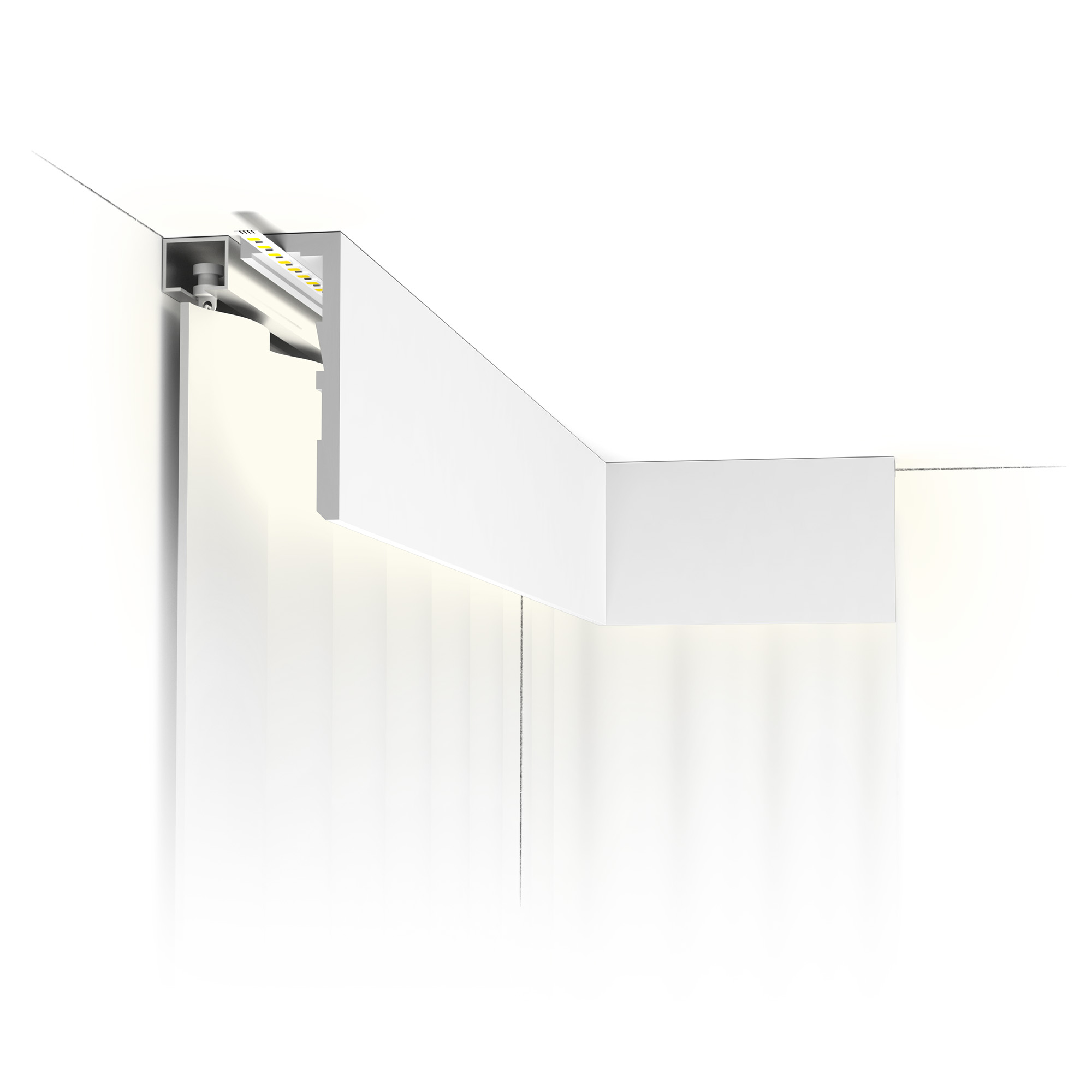 Le CX216 Ledge est notre profilé en L le plus polyvalent, réunissant corniche, support de rideaux et diffuseur de lumière dans un seul élément.